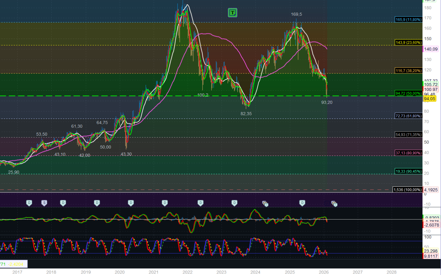 A livello tecnico la discesa è stata sconcertante. Il trend è in calo e non sembra offrire segnali di inversione. Se dovesse scende sotto 90 arriverebbe velocemente a 82. E forse, a quel punto, potrebbe ripartire. Al rialzo, difficilmete acquisterei senza vedere un'inversione, oltre che dei prezzi, anche delle medie mobili. Non resta che mnitorare e attendere l'evoluzione.
